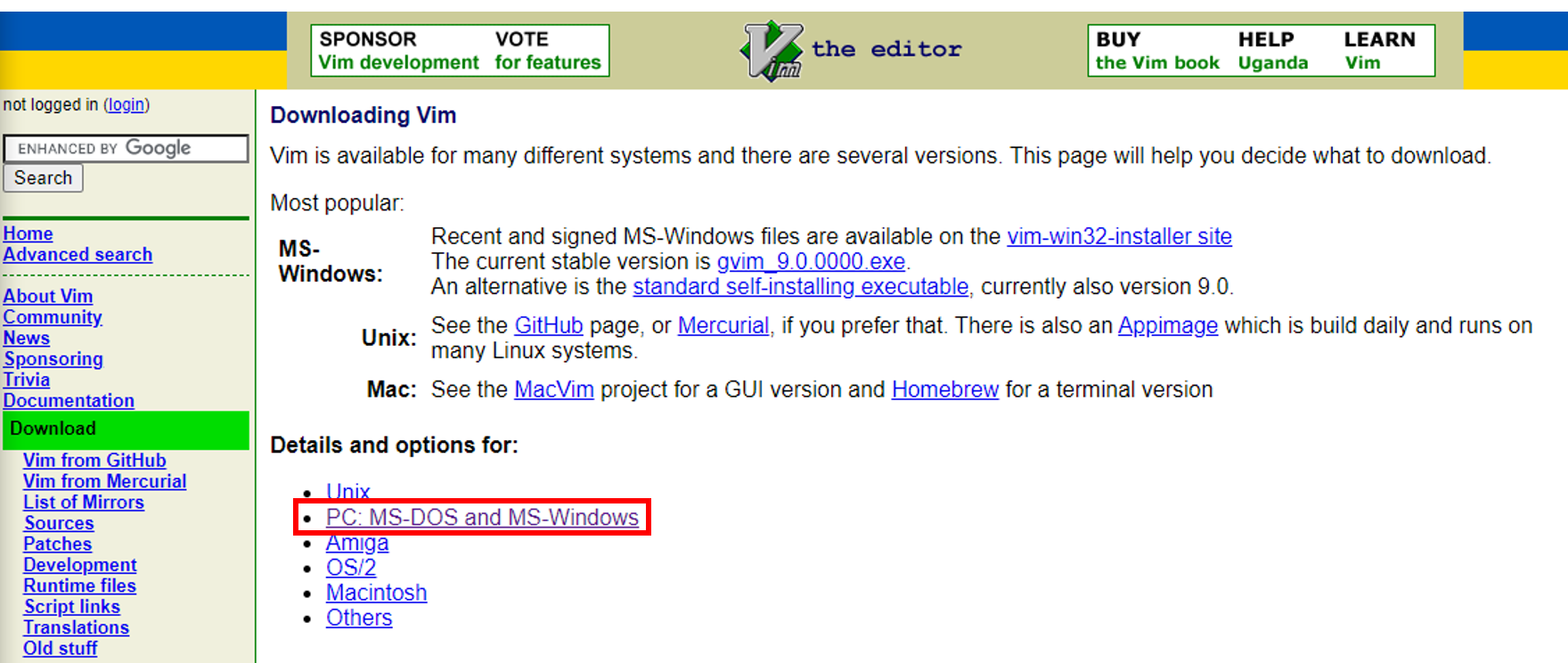 - 접속이 안 될 경우 https://www.vim.org 에 접속 후 왼쪽 리스트에서 Download 클릭